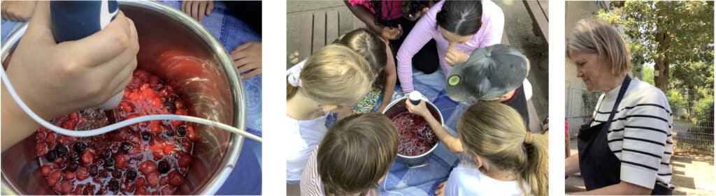 Die Schulgarten AG macht am letzten Tag selber Marmelade mit Früchten aus Frau Tromms Garten. Die Marmelade besteht aus: Johannisbeeren, Erdbeeren, Himbeeren und Brombeeren. So geht es: Früchte zerkleinern, Gelierzucker hinzufügen, pürieren und erhitzen. Die Marmelade muss 3 Minuten kochen und gerührt werden, dann kann man sie in Gläser füllen.